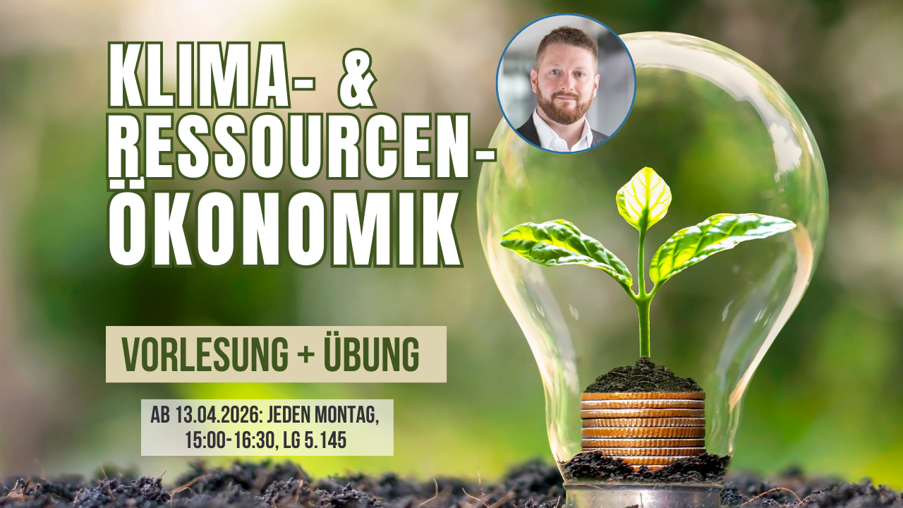 26. Februar 2026 Allgemein Klima- & Ressourcenökonomik (SS 2025) Lehre an der FAU Klima- & Ressourcenökonomik(Vorlesung + Übung im SS 2025)Im Sommersemester 2025 bietet Prof. Dr. Mario Liebensteiner die Vorlesung + Übung "Klima- und Ressourcenökonomik" an.– jeden Montag, 15:00–16:30, Raum LG 5.154– Start: 13.04.2026Link zum StudOn-Kurs Zuletzt aktualisiert: 27. Februar 2026 - 0:33